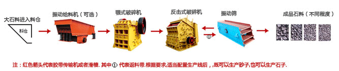 首先,大塊石料經料倉由給料機均勻地送進粗碎機也就是顎式破碎機進行初步破碎,然后,產成的粗料由膠帶輸送機輸送至反擊式破碎機進行進一步破碎,細碎后的石料進振動篩篩分出不同規格的石子,不滿足粒度要求的石子返料進反擊式破碎機再次破碎,形成閉路多次循環。其該階段也可以使用圓錐破碎機進行破碎。滿足粒度要求的石子由成品膠帶輸送機送往成品料堆。另外成品粒度可按照用戶的需求進行組合和分級,其為保護環境,可配備輔助的除塵設備。