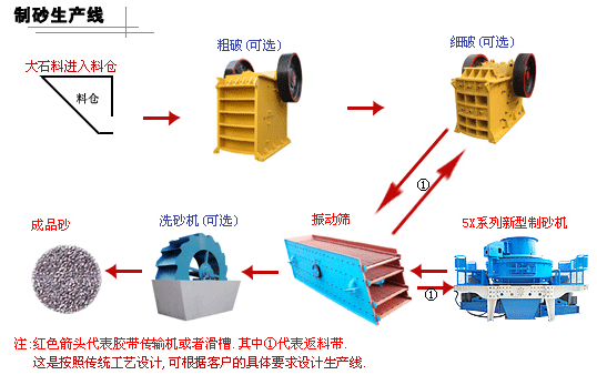制砂生產線主要由振動給料機、顎式破碎機、振動篩、離心沖擊式破碎機(制砂機)、洗砂機等設備組成,采用很好的中間集中控制,確保了整個工藝流程出料順暢,運行可靠,高效節能。生產線自動化程度高,整條生產線除了對設備的開機停機及日常維護之外,幾乎不需要人工操作。其生產效率高,運行成本低,產量大,收益高,成品石子粒度均勻、粒形好,符合國家高速用料要求。設備維修保養簡便,易損件采用目前國內更新高強耐磨材料,損耗少,使用壽命長,能為客戶帶來可觀的經濟效益。制砂生產線是一種生產建筑用砂和石料的專用設備,比傳統制砂機節能 50% 。它可以把各種巖石、砂石,河卵石制成附和各種粒度的建筑用砂,砂質粒度均勻、耐壓強度高,遠比天然砂、普通錘式打砂機生產的砂更符合建筑要求,更能提高建筑質量。設備具有性能可靠、設計合理、操作方便、工作效率高等特點,其代表新世紀更新水平的現代化生產線。